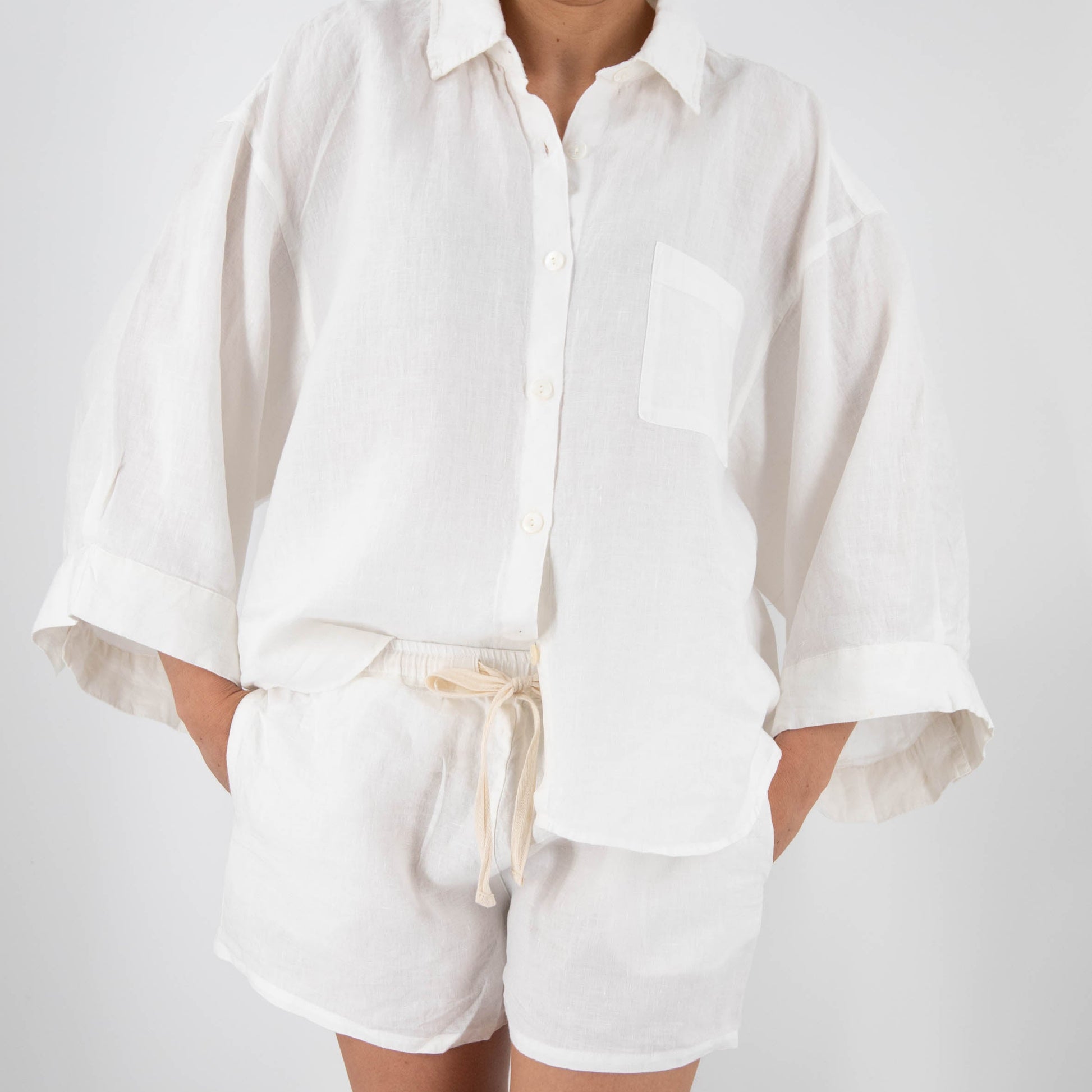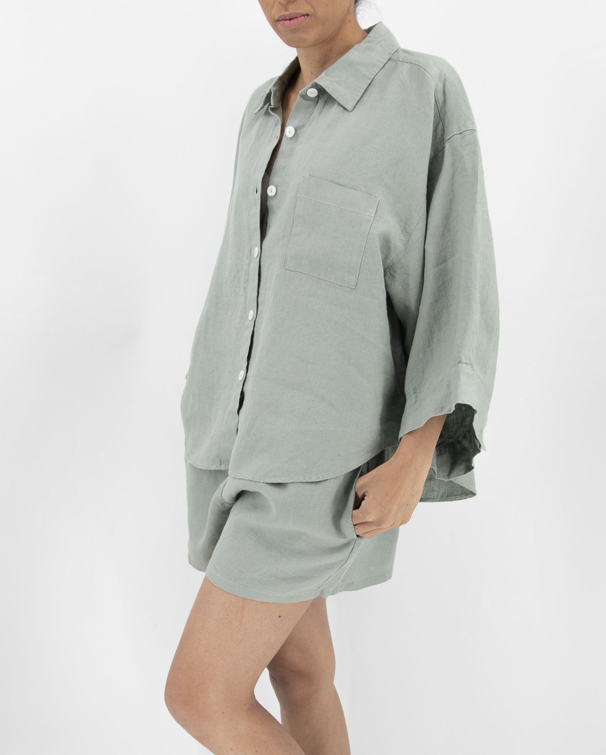 • Our Linen Pajamas—an oversized shirt replete with billowing arms and a front pocket paired with loose-fitting, elastic-waisted shorts—are ideal for sleeping in comfort and spending lazy days at home. The set is made from 100% French linen—expect comfort, ease, and beauty.
