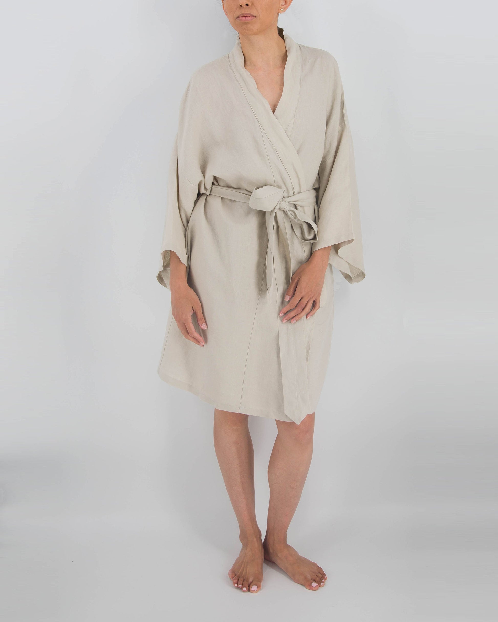 • Our Leia Linen Robe, comprised of French linen, is a Japanese-inspired, mid-length (hits right above the knee) Kimono-style statement piece. The robe has hidden, low-hanging pockets on the side seams and is one size fits most (0-16).