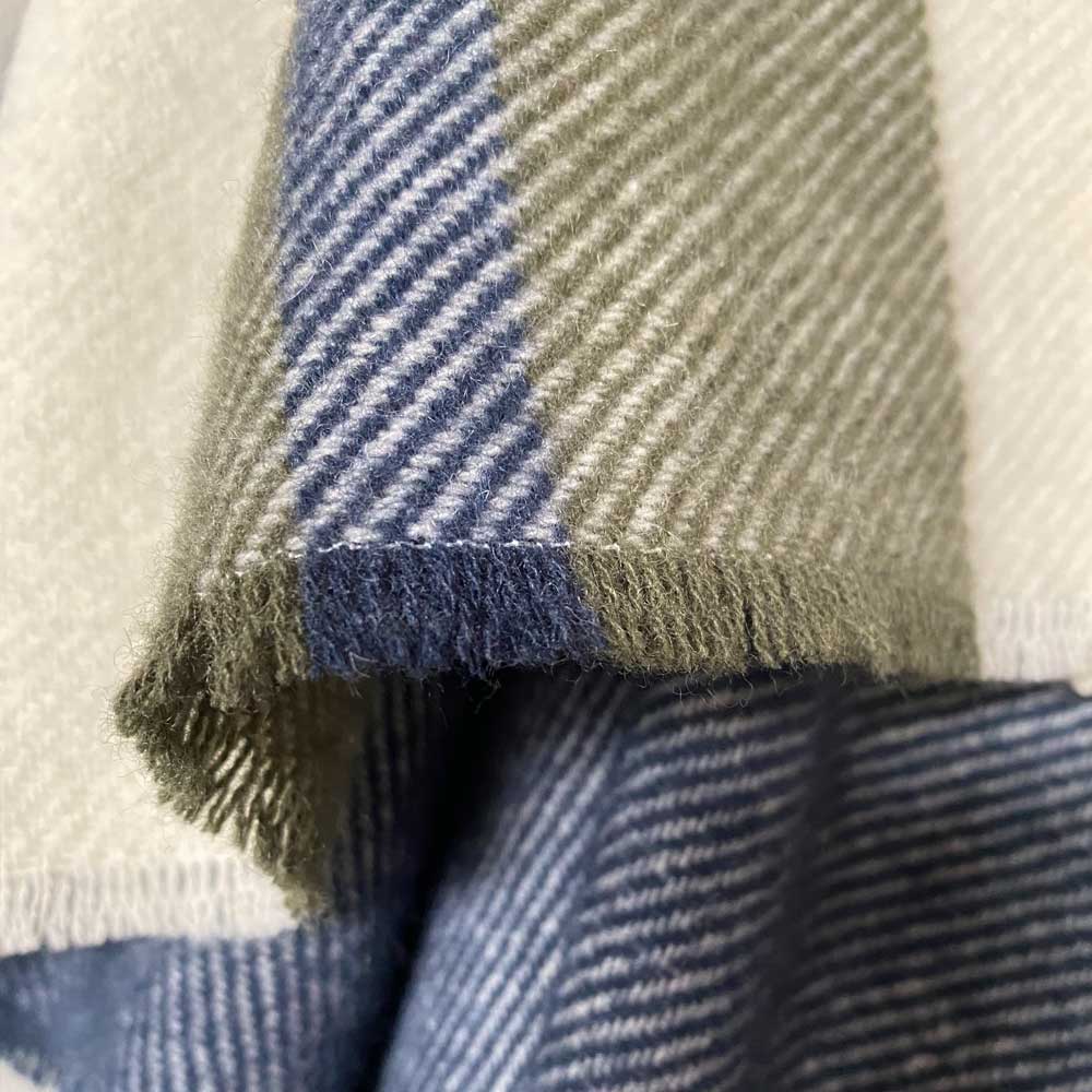 This pure lambswool blanket is a striking textural throw with bold stripes of navy and hunter on a warm white background. Naturally insulating, lambswool is a soft midweight blanket making it the ideal layer. Accented with playful fringe, you’ll want this blanket to sit on the grass and soak up the sun or wrap up in love and ward off a blustery chill.