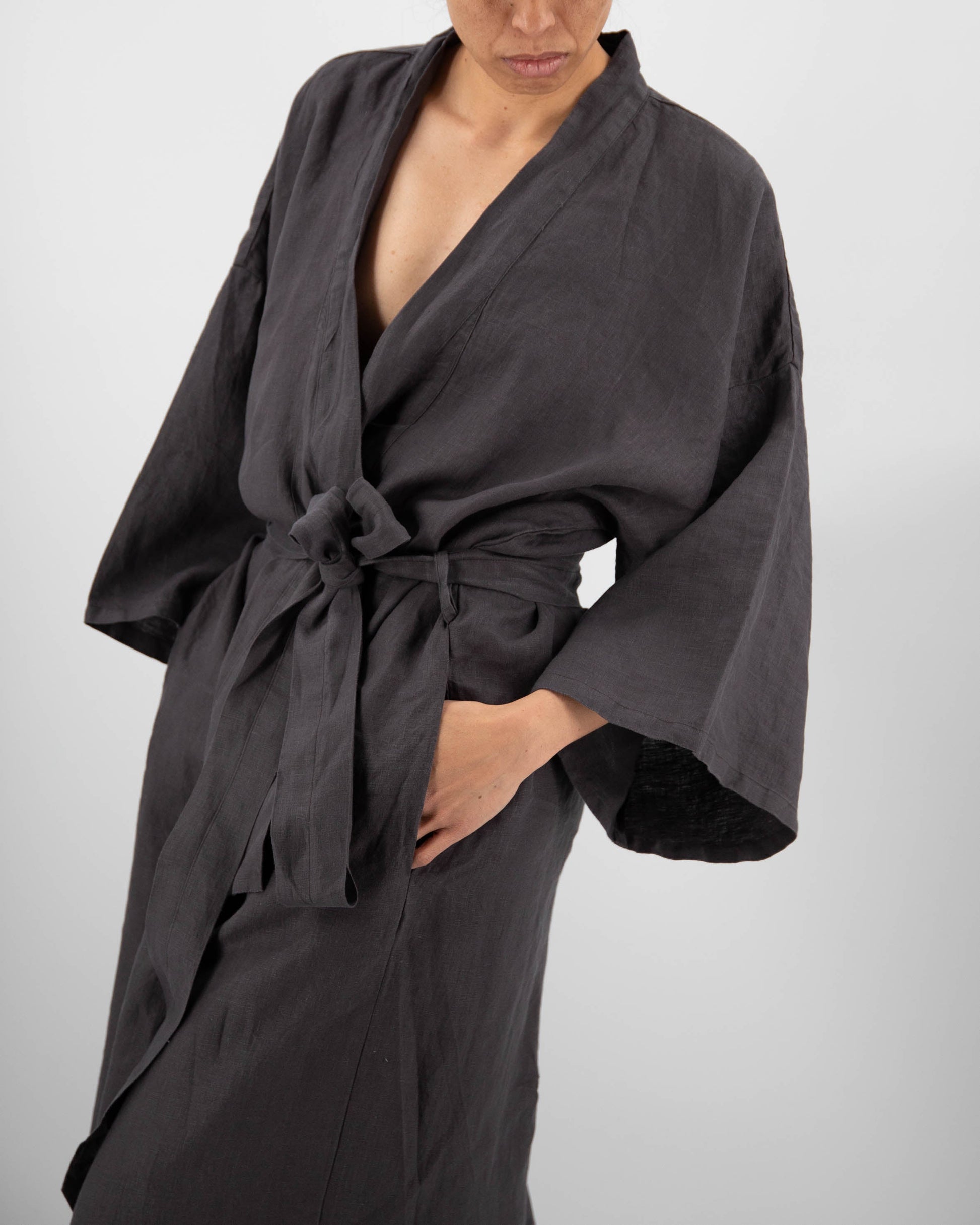 • Our Linen Robe, comprised of French linen, is a Japanese-inspired, full length Kimono-style statement piece. The robe has hidden, low-hanging pockets on the side seams and is one size fits most (0-16).