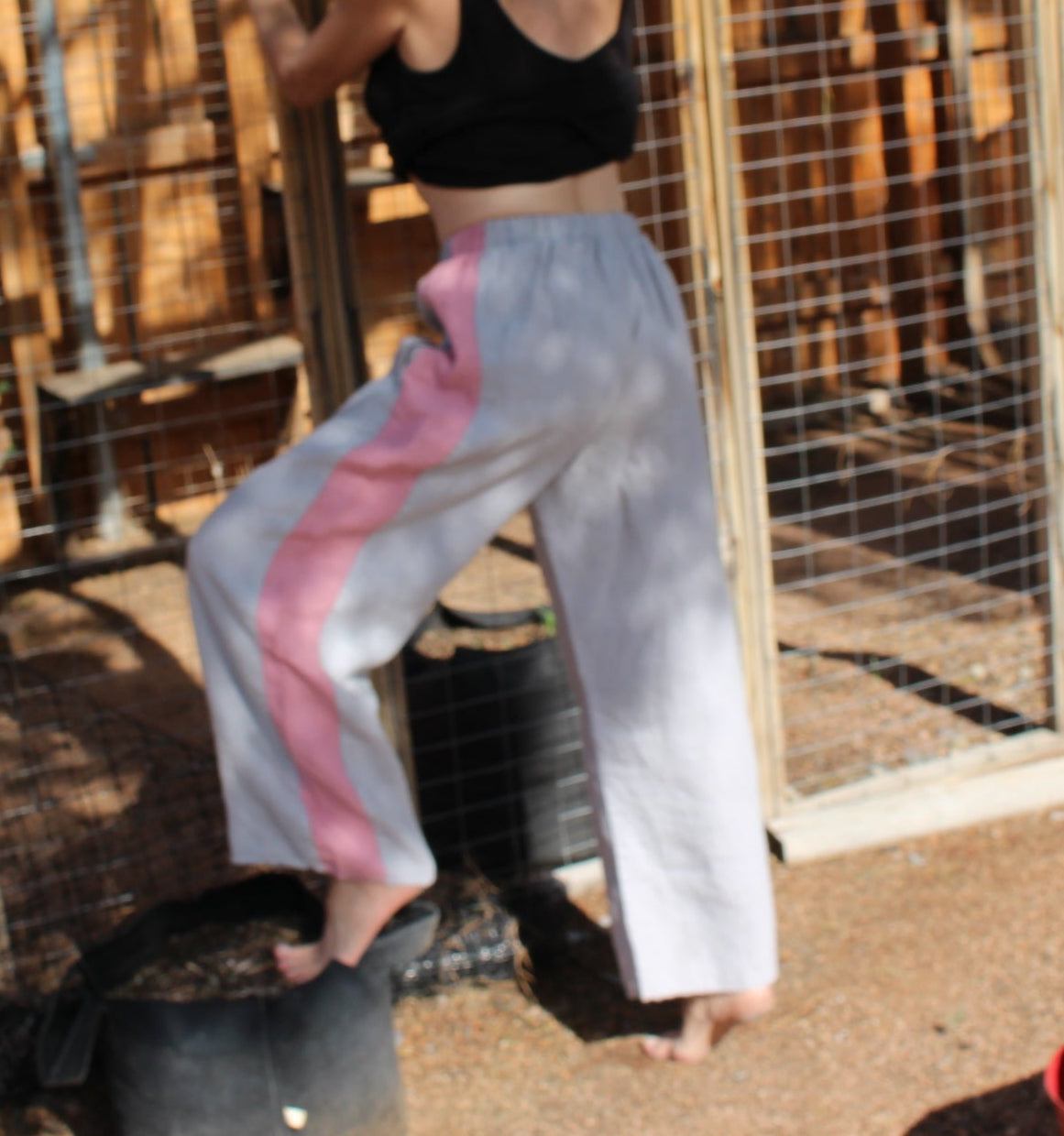 The Ms Polly Lounger is in a rich storm blue and kissed by playful raspberry stripes that dance down the sides. Ms Polly has patch front pockets, elastic waist, and a raw hem. This piece is equal parts comfort and quiet while having a touch of feistiness!